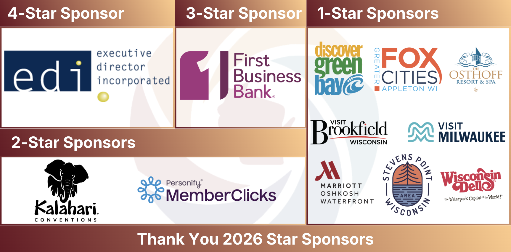 WSAE Sponsor OpportunitiesStar Sponsor Program SummaryThe WSAE Star Sponsor Program is designed to highlight the generosity and commitment of our sponsors through ongoing publicity and event sponsorship opportunities throughout the year. Each Star Sponsor level includes a WSAE membership and a designated number of event registrations, providing valuable engagement and visibility within the Wisconsin association community. Your Star Sponsor commitment directly supports the mission of the Wisconsin Society of Association Executives — fostering meaningful connections and enhancing the competencies of association professionals through dedicated leadership and collaboration. Flexible Sponsorship Levels For more information or to discuss a custom sponsorship package, please contact the WSAE Office at [email protected]. Enrollment Information